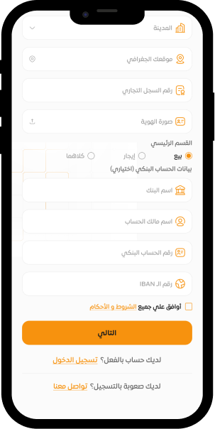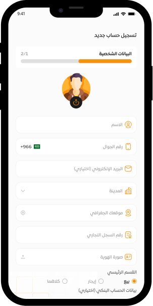 قم بتسجيل معلوماتك الشخصية بسهولة، مثل الاسم ورقم الجوال والمدينة، مع إمكانية إضافة موقعك الجغرافي ورفع المستندات المطلوبة. يمكنك أيضًا اختيار نوع الحساب وإدخال بياناتك البنكية (اختياري) لإدارة معاملاتك بكل سلاسة.
