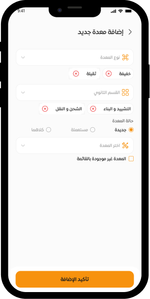 قم بإضافة معدة جديدة إلى النظام بسهولة. أدخل جميع البيانات المطلوبة لضمان تسجيل المعدة بشكل صحيح وبدء استخدامها فوراً في العمليات والمعدات الخاصة بك.